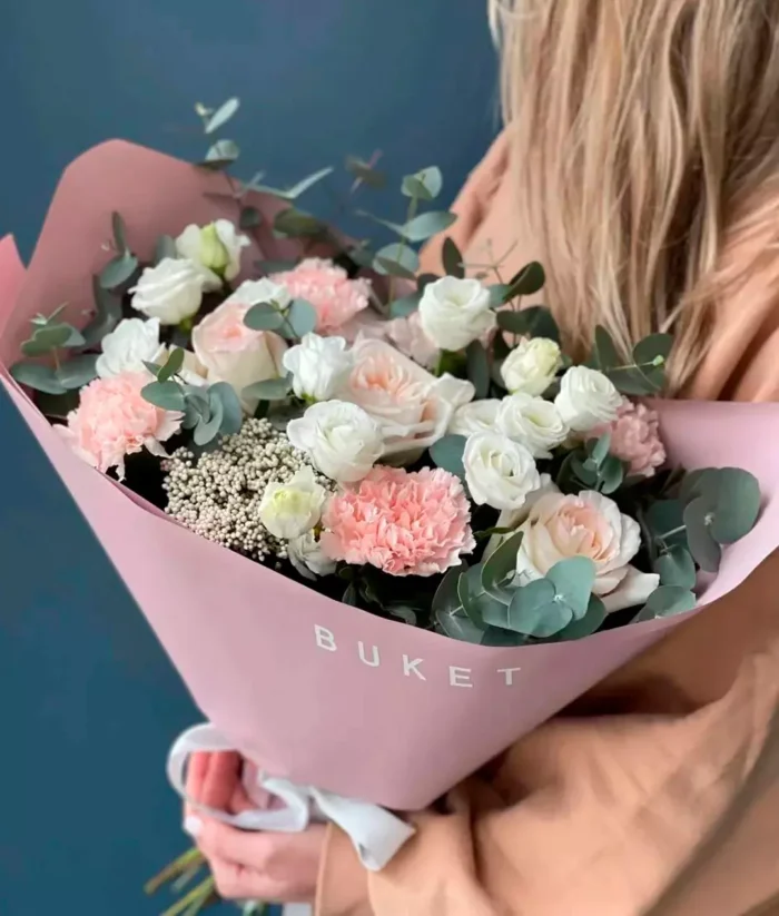 Букет «Летний Поцелуй»: роза, эустома, диантусы и эвкалипт — идеальный подарок для любимых. Цветы Москва!