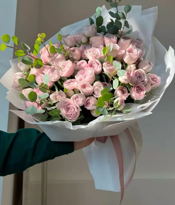 Букет «Нежные Объятия» из кустовой пионовидной розы розового цвета. Яркие цветы в Москве для особых моментов. Заказывайте сейчас!