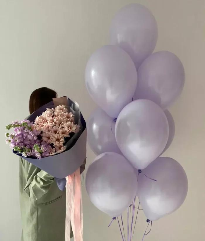 Композиция «Нежные моменты» — шары и букет из хризантем, гвоздик и гипсофилы. Закажите цветы и шары в Москве с доставкой!