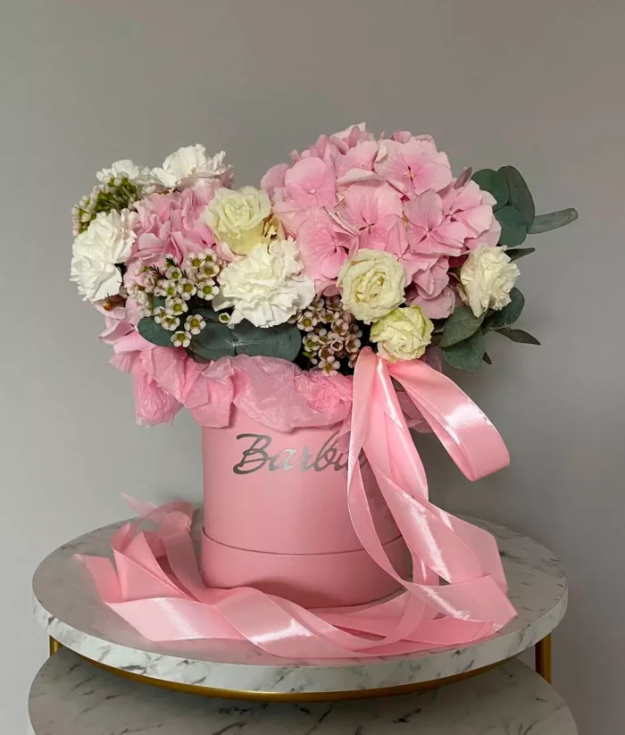 Состав: розовые гортензии, белые и розовые гвоздики, зелень и мелкие белые цветы.