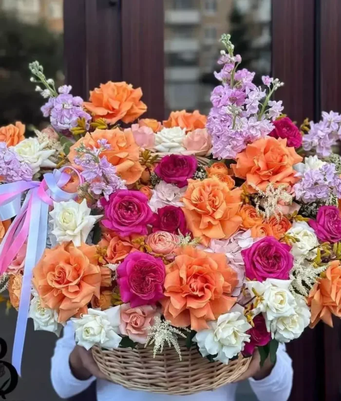 Яркий букет в корзине «Сияние любви» из роз и маттиолы. Доставка по Москве. Цветы для праздника. Состав: розы, маттиолы.